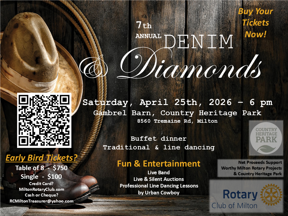 Guests, Rotarians, family and friends will enjoy food and fun in support of a great cause at Country Heritage Park's Gambrel Barn on the night of Saturday, April 25th, 2026 at 6 pm. Net proceeds go to worthy local causes supported directly by Milton Rotary, including programs and projects that primarily focus on Milton's youth, as well as notable programs at Country Heritage Park.